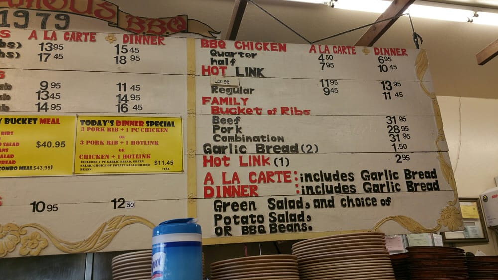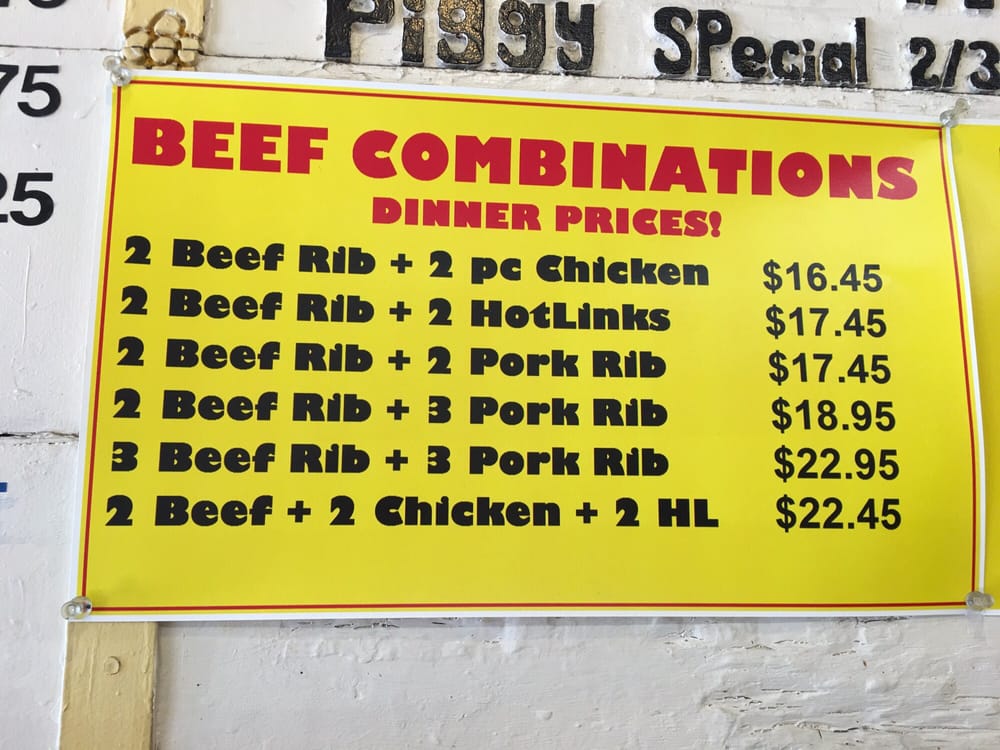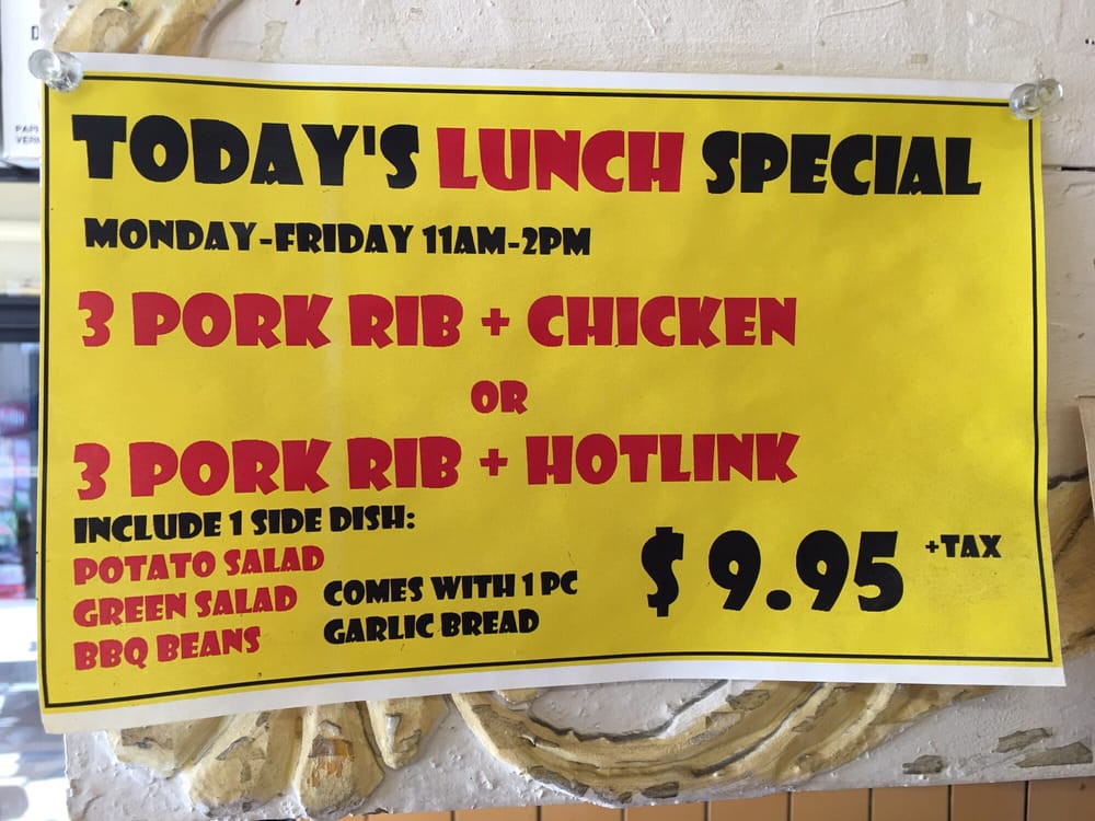 Choose from pork ribs, hot link, BBQ chicken and pork tips. Includes 1 side and garlic bread.
