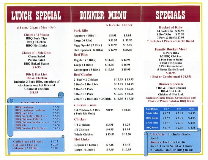 Choose from pork ribs, hot link, BBQ chicken and pork tips. Includes 2 sides and garlic bread.